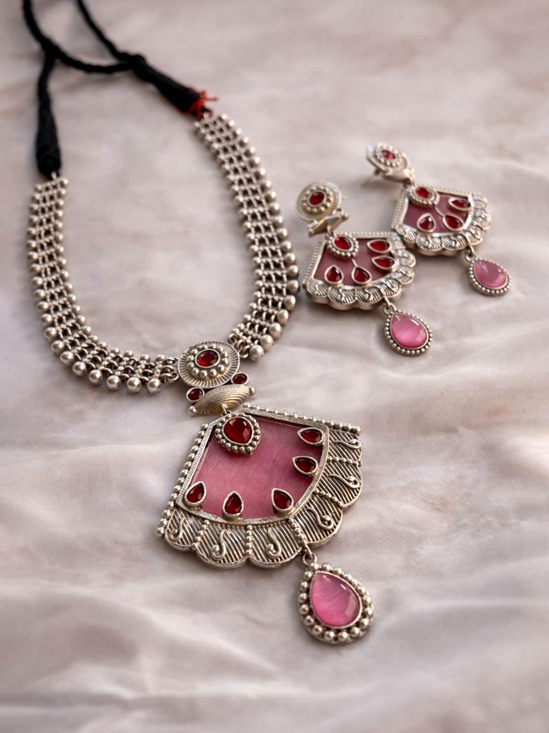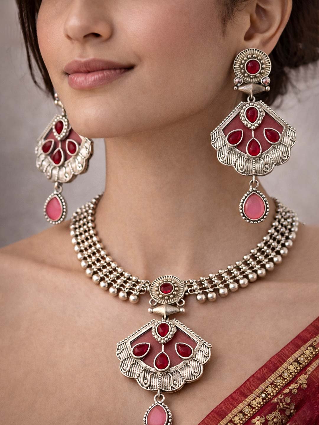 An elegant antique-inspired necklace set featuring soft pink stones and intricate craftsmanship. Perfectly balanced between subtle and statement, this piece adds charm to both everyday and festive outfits.