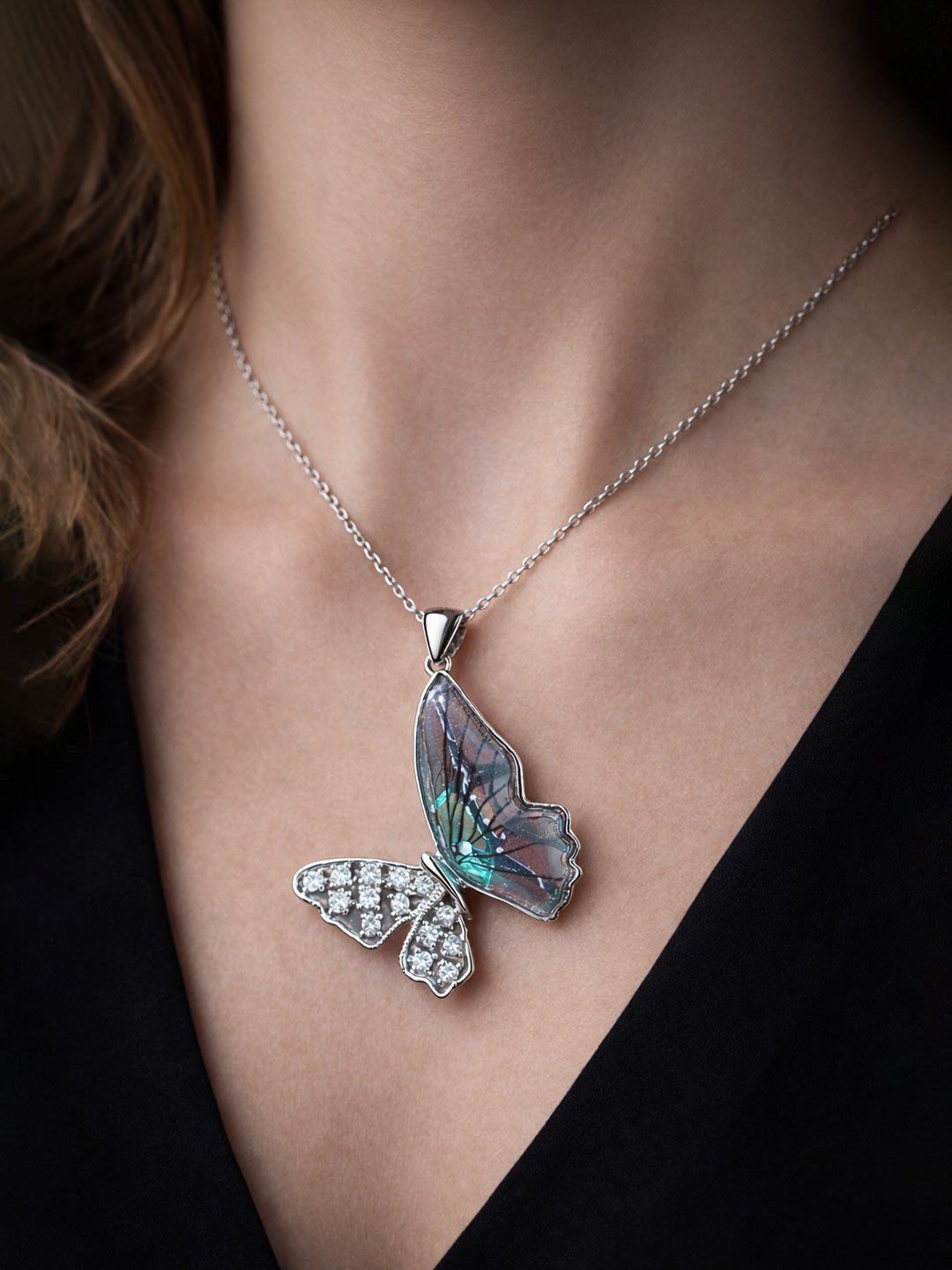 An exquisite butterfly pendant with shimmering iridescent wings and crystal-studded details. Crafted to bring elegance and brilliance to your look.