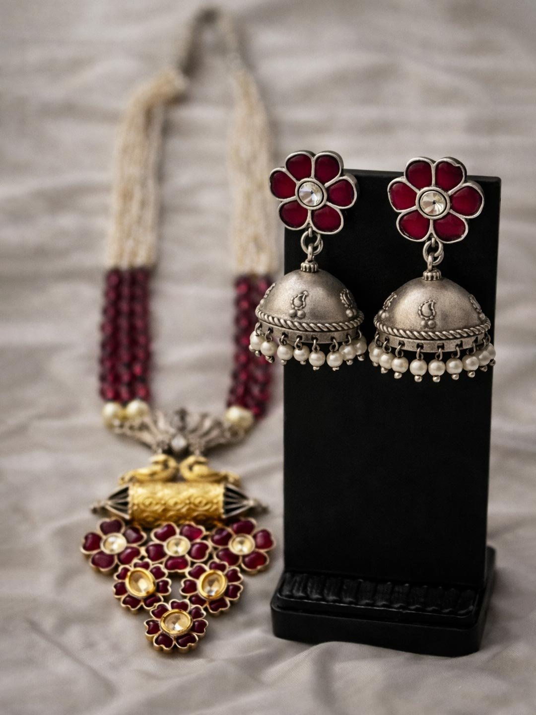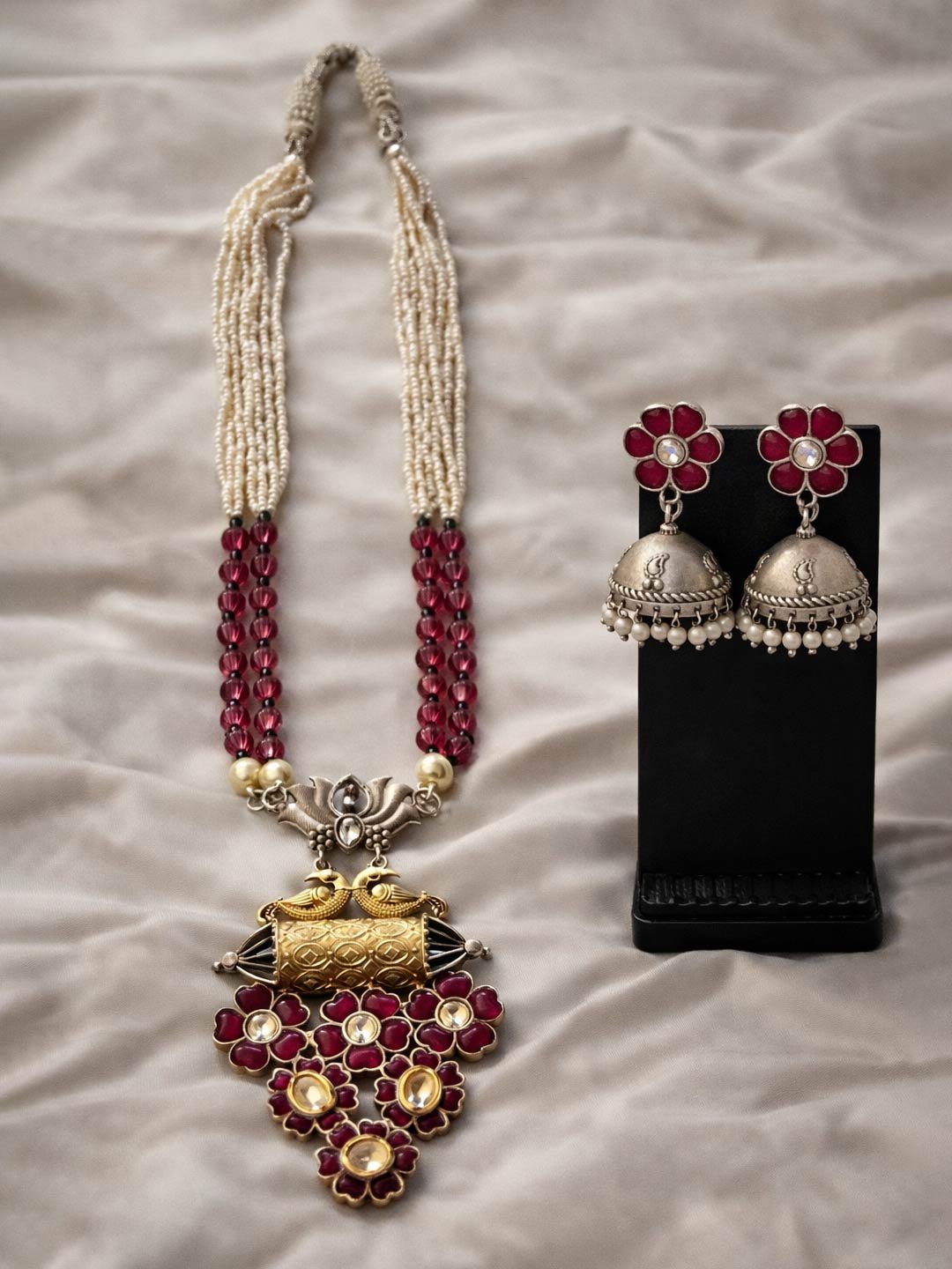 A beautifully crafted necklace set featuring layered pearl and ruby-toned beads, highlighted with intricate floral kundan motifs and an antique oxidised finish. Paired with classic jhumka earrings, this set brings a perfect blend of tradition and elegance.